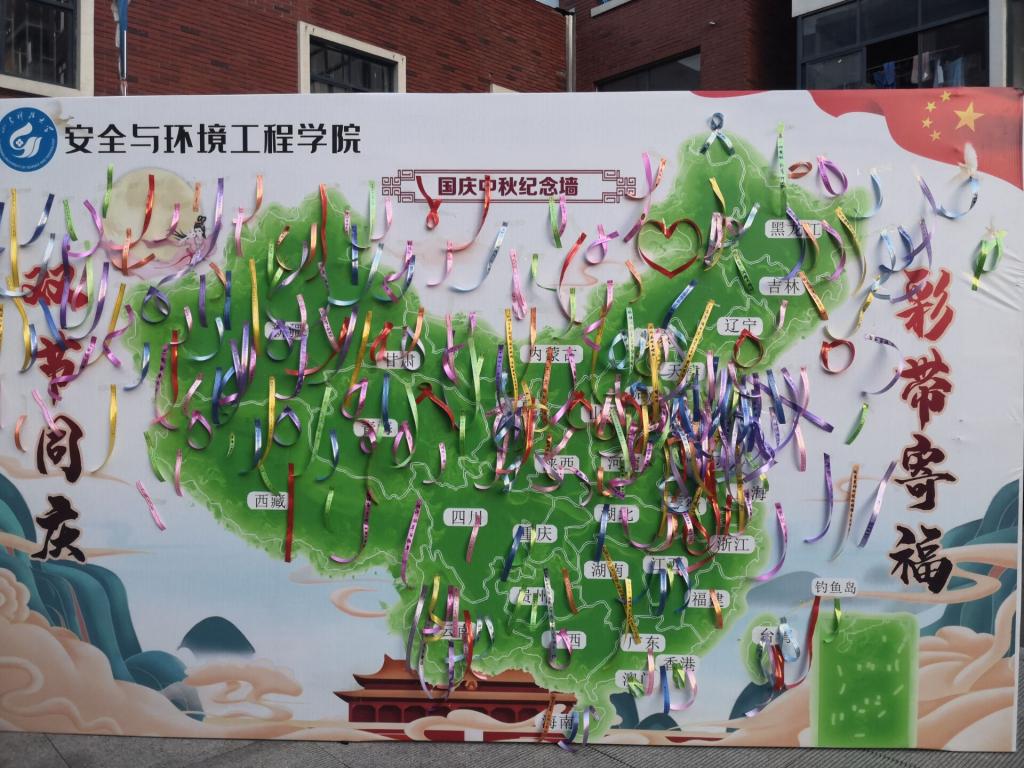 活动现场,安全学子用彩带在“双节同庆,彩带寄福”表白墙上写下了自己对祖国的热爱和对家人思念。“祝福祖国母亲繁荣永昌,希望自己可以用所学保卫祖国长盛久安!”2020级新生们也在彩带上写下了自己对老员工活的憧憬和对未来美好生活的愿想。美好的祝福随着五彩斑斓的彩带飞舞在中华民族的地理版图上,在阳光照耀下显得格外熠熠生辉。