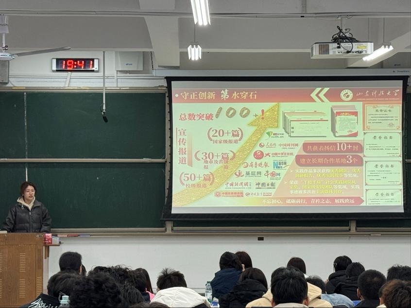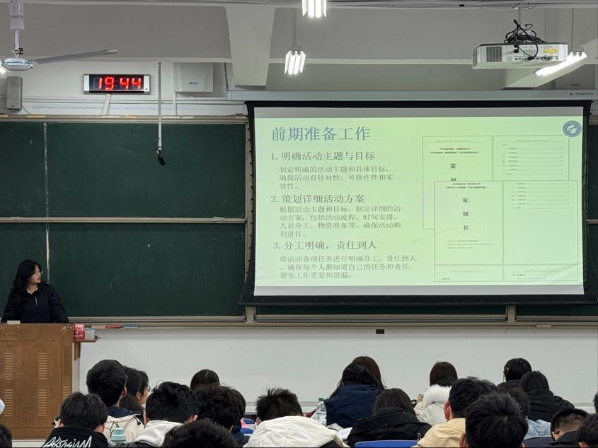 李翊尘通过《雷锋精神的时代回响》主题短片,结合当代青年员工的使命与担当,生动讲述了雷锋同志的生平事迹,深刻诠释了雷锋精神内涵。她鼓励同学们要秉持“奉献、友爱、互助、进步”的志愿者精神,投身到社会实践、志愿服务的活动中去,走出校门、走进社会,用双脚去丈量、用双眼去看见、用双耳去倾听,把论文写在祖国大地上。肖思豪以班级实践为例,系统讲解了从需求调研到活动实施的全流程,重点强调了"精准服务"对提升志愿服务效能的重要作用。崔书华和衣政翰分别结合团支部社会实践工作实际,分享了志愿服务中的沟通技巧、活动策划及团队协作等经验。