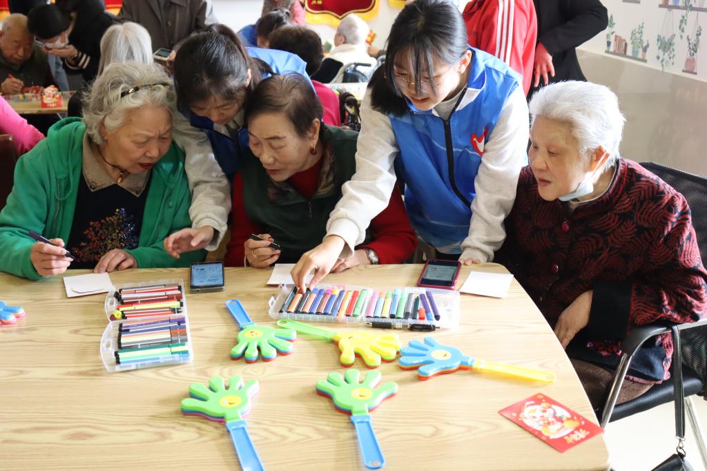 文艺表演结束后,志愿者们分组陪伴爷爷奶奶开展手绘贺卡、象棋对弈活动。志愿者们耐心陪伴老人们用彩笔描绘节日祝福,用棋子博弈青春激昂。手工、下棋之余,志愿者们围坐在爷爷奶奶身旁,聊天叙事,分享生活趣事,聆听人生故事。护养院张奶奶感动地说:“孩子们能来陪我们过节,心里特别暖!”