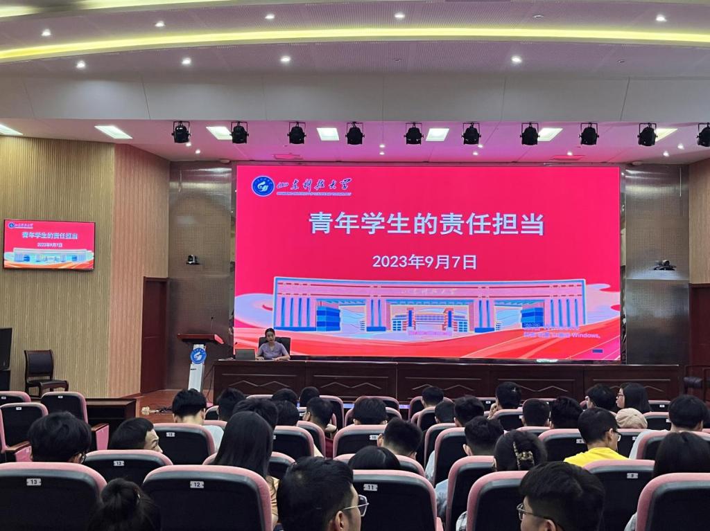 张娜以《责任之歌》切入主题,结合“最美老员工”先进事迹讲述“奋斗的青春最美丽”的青春故事。随后她以“责任”为主线,从“责任、负责任、负责任的人、责任成就人生”四个方面层层深入,并结合生动鲜活的案例和丰富的历史文献为同学们展开讲述。最后张娜结合自己的责任教育亲身经历,分享了新时代青年如何肩负责任、体现担当等相关内容。