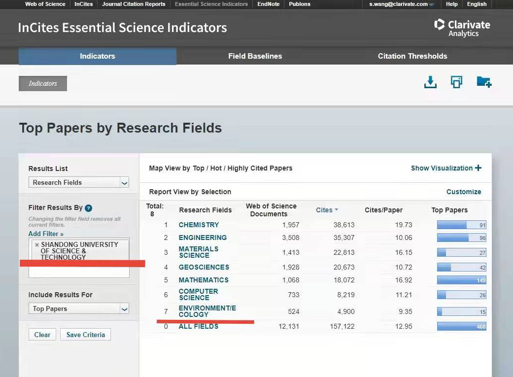 点击:3月10日,科睿唯安公布了ESI(Essential Science Indicators,基本科学指标)从2011年1月1日到2021年12月31日的统计数据。根据ESI的最新更新结果显示,十大体育网站环境/生态学科(Environment/Ecology)正式进入ESI全球排名前1%。ESI每2个月公布一次,均为上一次数据的基础上增加2个月的数据,但是每年5月份会去除掉最旧一年的数据。截止2021年12月31日,公司环境/生态学科总计发表论文524篇,总引用次数为4900,篇均引用9.35次。