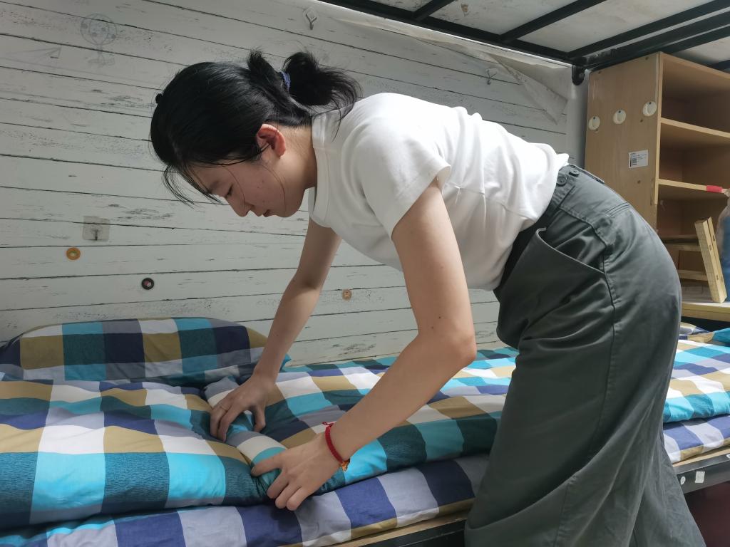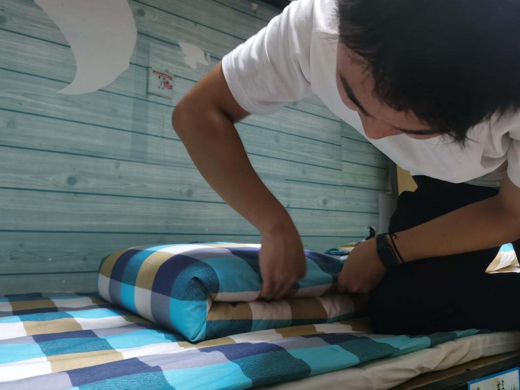 “被子三分叠七分整,要牢记‘平、折、压、抠、卡、齐、直、正’这个叠被要领。"新生宿舍里,2020级退役员工陈现超细致耐心地向新生们讲授叠好被子的诀窍和方法。被角一抖,用手抹平,经过他的“加工制作”,一床“豆腐块”般的被子诞生了,新生们纷纷被这娴熟的动作圈粉。被子一捋,四四方方;书籍归类,整整齐齐;鞋子衣物,各有归处....在长达一个多小时的“高水准”内务规范“现场实操”中,陈现超和孙雅晴一针见血地指出新生宿舍中内务整理的不规范之处,示范整理动作干净利落。从书的摆放到阳台杂物的放置,从洗漱用品的归类到柜中衣物整理,他们都给了新生们进行了高效的归纳指导,前几分钟还稍显杂乱的宿舍眨眼间就变得整齐宽敞,大家纷纷感慨这次的内务整理教学真是“硬核”!