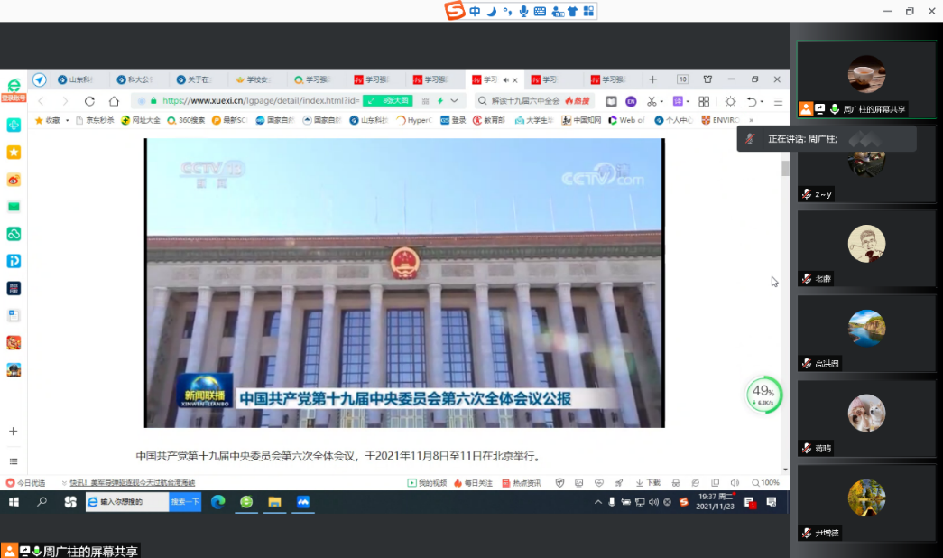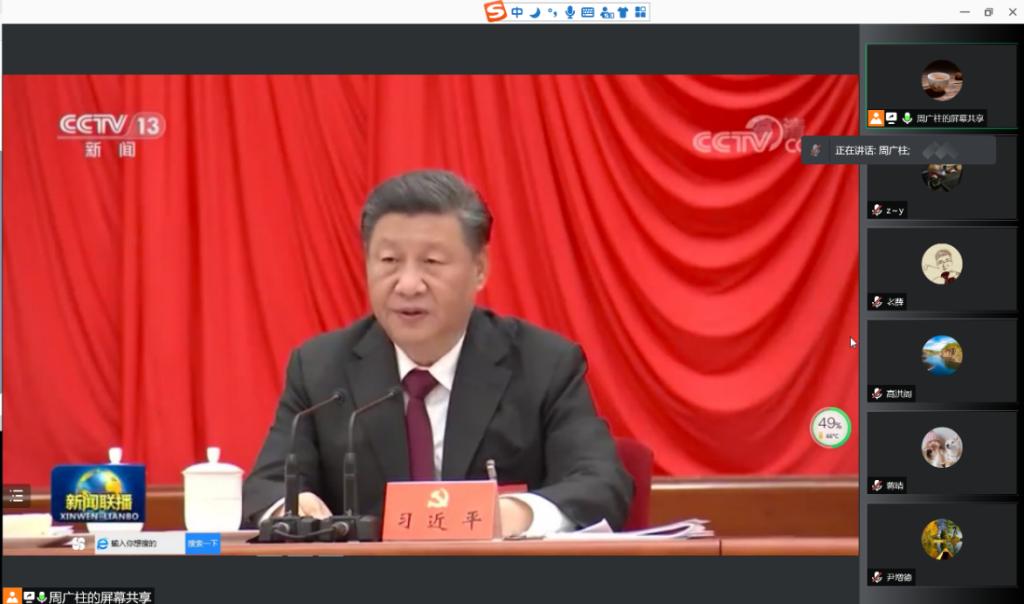周广柱同志带领支部同志和老师们以视频的形式系统学习了会议决议全文,并强调要学习好、宣传好、贯彻好党的十九届六中全会精神,抓好学习,联学深思,把学习贯彻全会精神与学习贯彻习近平总书记“七一”重要讲话精神、与党史学习教育结合起来,全面系统学习领会党的十九届六中全会的重大意义和实践要求。