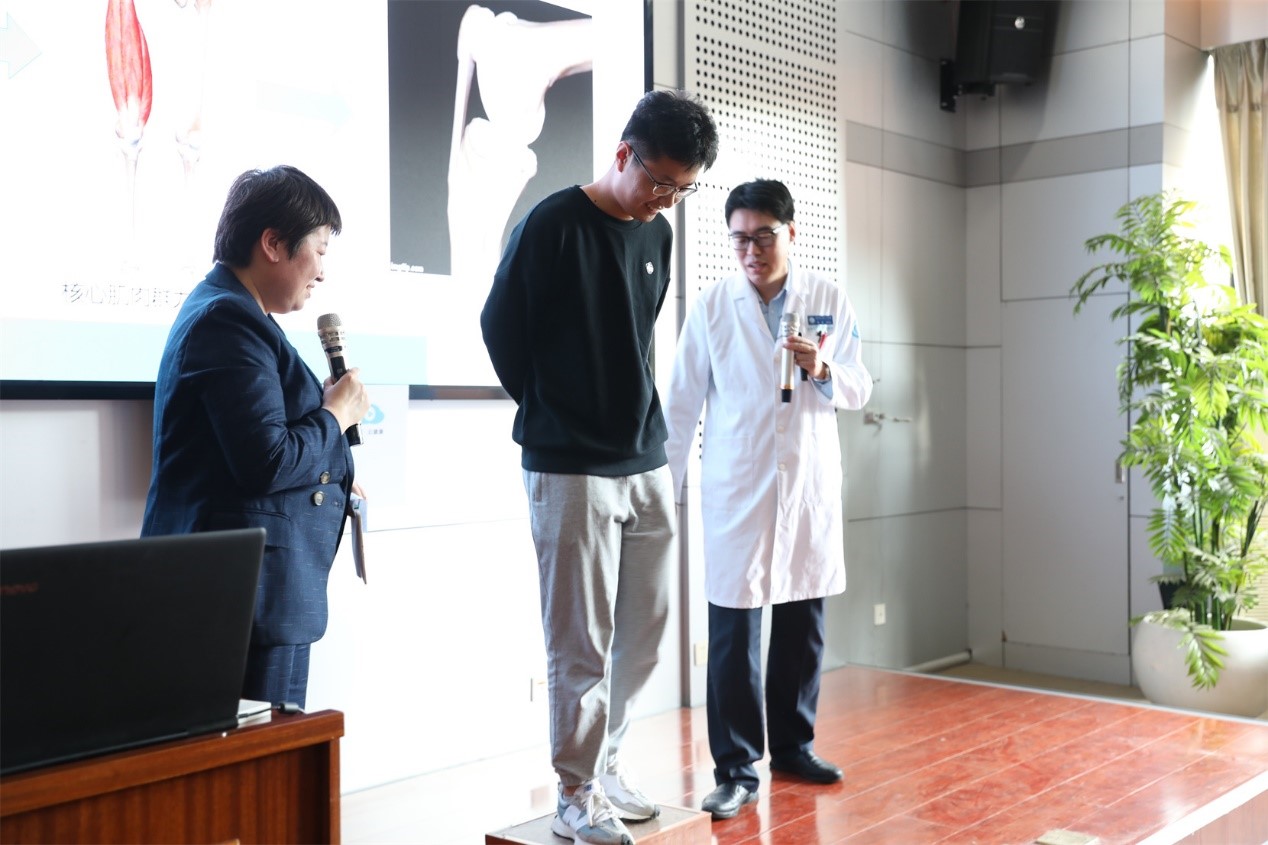 现场,李根通过亲身示范为大家介绍了膝关节自我检查方法和运动健康防护流程,为了能够让员工近距离感受体验。讲师团与师生互动,通过简单的肢体动作进行自我检查,将培训活动推向了高潮。并对同学们操作不规范的地方提出改进意见,使每位到场的同学都能规范掌握膝关节损伤自我检测方法。