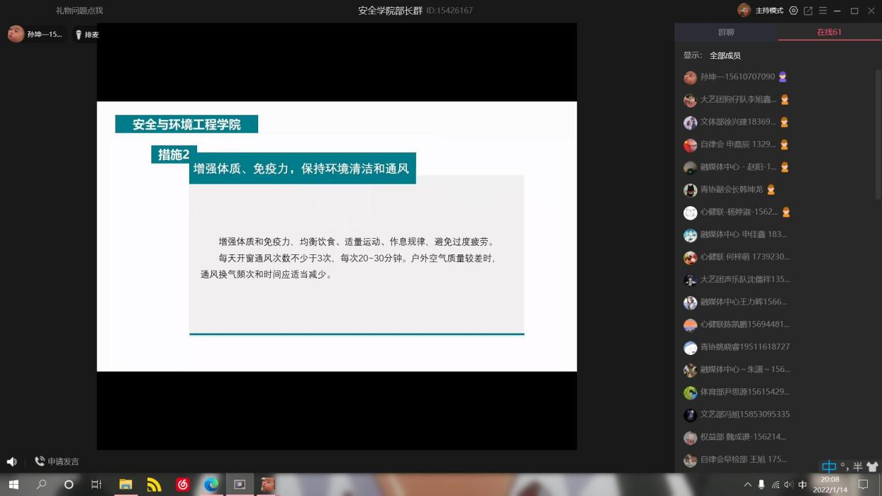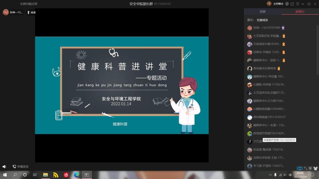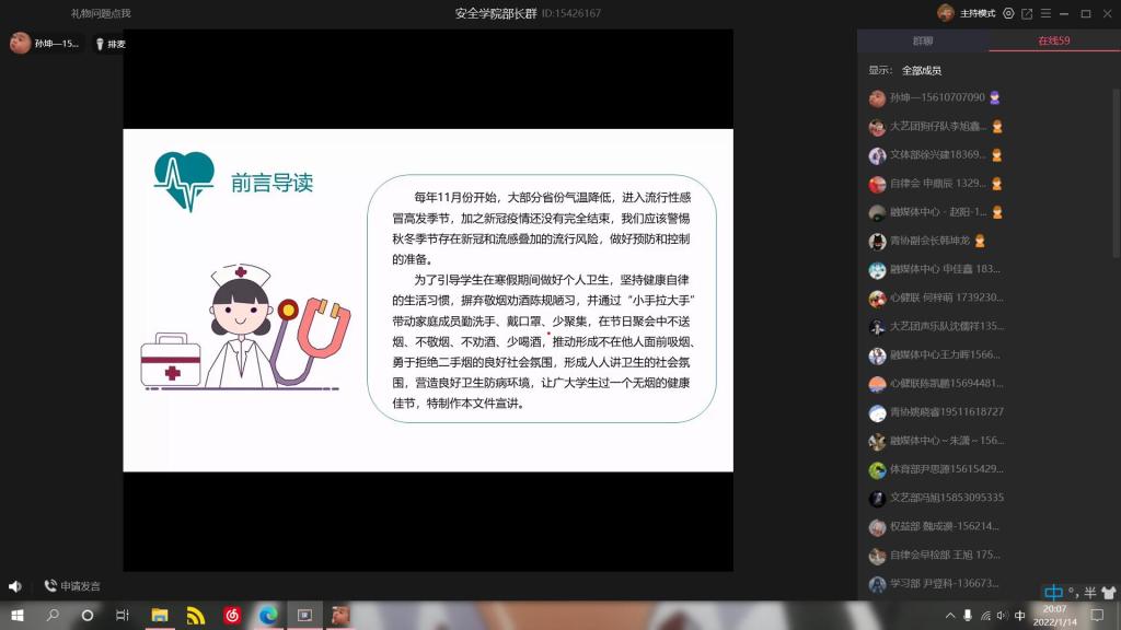 点击:为贯彻落实《关于开展“迎新春”爱国卫生专项活动助力常态化疫情防控的通知》精神,提高员工安全意识和自我防护能力,养成健康的行为习惯和生活方式。1月14日,十大体育网站组织开展了“健康科普进课堂”线上教育活动。