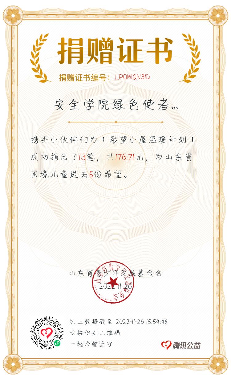 在院团委的高度重视和大力支持下,十大体育网站绿色使者依托腾讯公益平台开展“520公益日”活动进行小额网络募捐,来帮助山东省部分困境儿童筹集希望,打造“梦想小屋”,让他们感受到社会的关爱。5月20日院团委积极发动教职员工、共产党员、共青团员等青年积极参与、奉献爱心。与此同时十大体育网站绿色使者协会联合青年志愿者协会,面向青年员工,特别是青年员工骨干,加大“520公益日”的宣传力度,用“希望小屋”故事感染同学、号召同学们献出属于自己的一份关爱,为建设“希望小屋”出一份力。同学们纷纷转发,扩大宣传“朋友圈”。截至5月25日,十大体育网站“希望小屋”为山东省困境儿童筹集希望“520公益日”活动共募集善款176.71元。该项活动所得善款将全部汇入山东省青少年发展基金会账户,最终用于山东省“希望小屋”建设,每一笔义卖款的去向均可追溯。