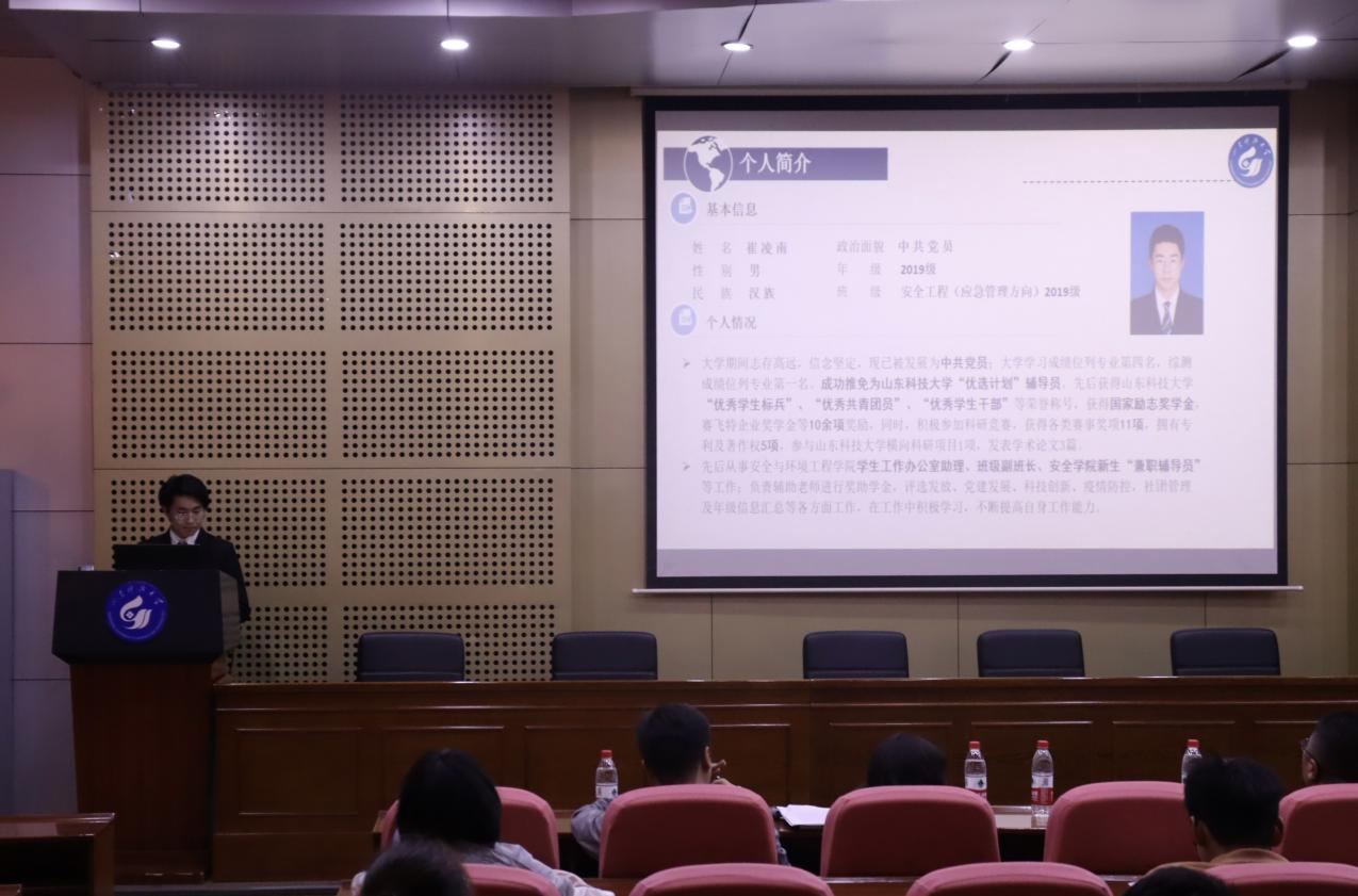 答辩会上,候选人声情并茂的进行了个人事迹展示:思想积极进步,在党团组织中担任职务;综测、专业成绩名列前茅;学科竞赛获奖无数;热心公益积极参与志愿服务......他们以优异的成绩,优秀的事迹充分展现新时代安全学子昂扬的精神风貌。来自2019级环境工程1班李洪磊通过展示自己所参加的科技创新竞赛和取得成果震撼全场;来自安全工程2020级1班的邴誉娴结合自己学习成绩和出色的员工会工作表现赢得现场评委阵阵掌声;还有的同学着重对自己的特长进行详细地叙述,将自己在某一特长的挖掘、发展以及所取得的成就进行全方位展示,给大家留下了深刻的印象。
