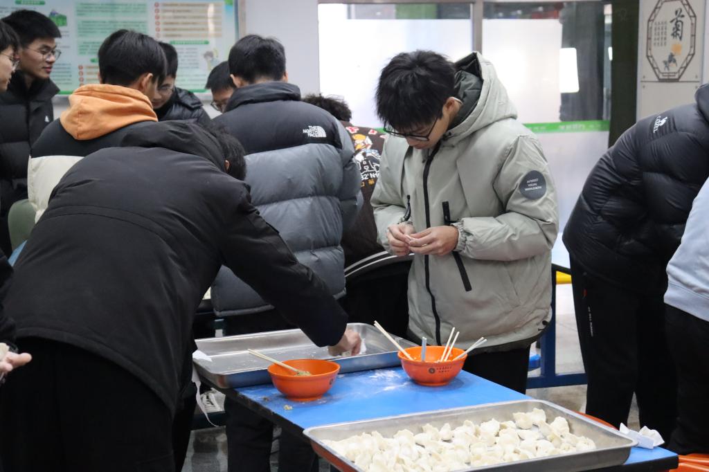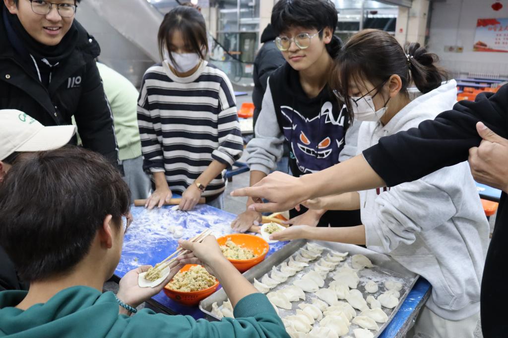 在学苑餐厅,同学们围聚在餐厅工作人员身边,领取馅料、面粉、擀面杖等各类物料工具。餐厅工作人员为大家示范包饺子的技巧,手把手现场教学。同学们沉浸式体验了包饺子的全过程。不一会儿,桌子上摆满了形态各异的饺子,有的像元宝、有的像花儿、有的像小船儿……窗外北风萧瑟,室内饺子香气四溢,同学们吃着亲手制作的造型各异的饺子,在欢声笑语中感受到十大体育网站“家”的温暖。