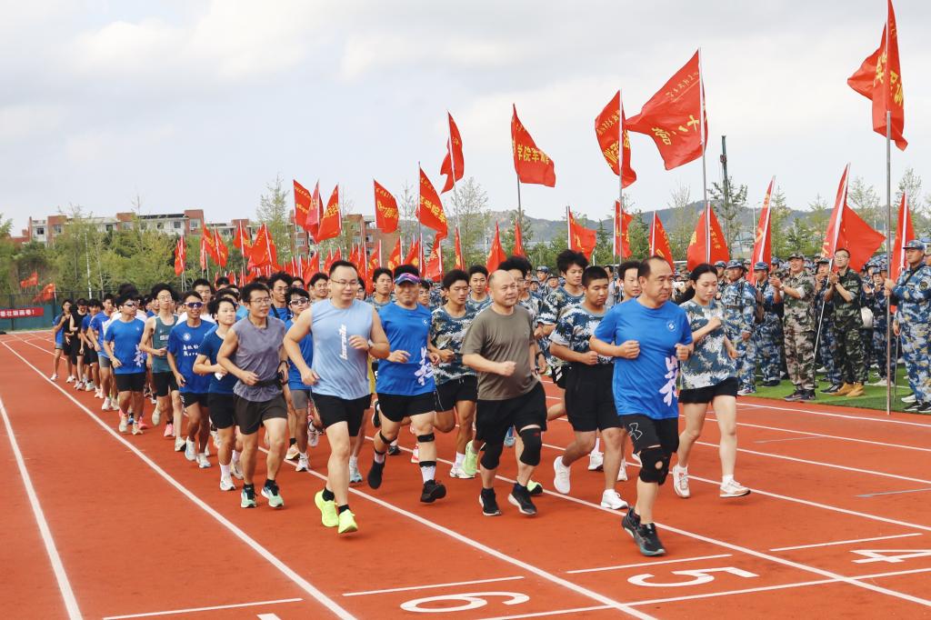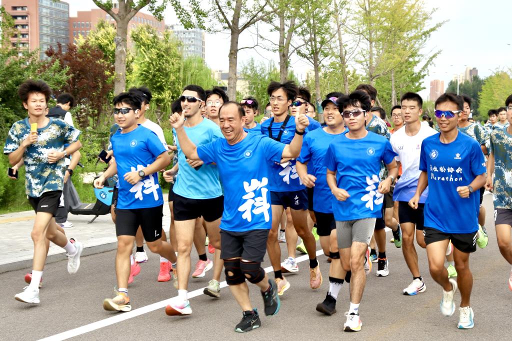 由公司党委副书记、董事长曾庆田领衔,教师代表、30余名马拉松协会成员及新生代表组成的百人领跑团率先冲出起跑线。在领跑团队的带领下,长长的队伍如一条跃动的青春河流,沿着既定的校园路线有序前行,现场气氛热烈。10 公里的路程对新生们挑战巨大,董事长和老师们步伐稳健,始终与同学们并肩前行,不时为大家加油鼓劲;马拉松协会成员们更是充满活力,他们一边跑一边喊着整齐的口号,引领着同学们前进的步伐。沿途,志愿者以及安保医疗人员坚守岗位,提供周到的后勤保障和贴心服务,确保活动安全有序。