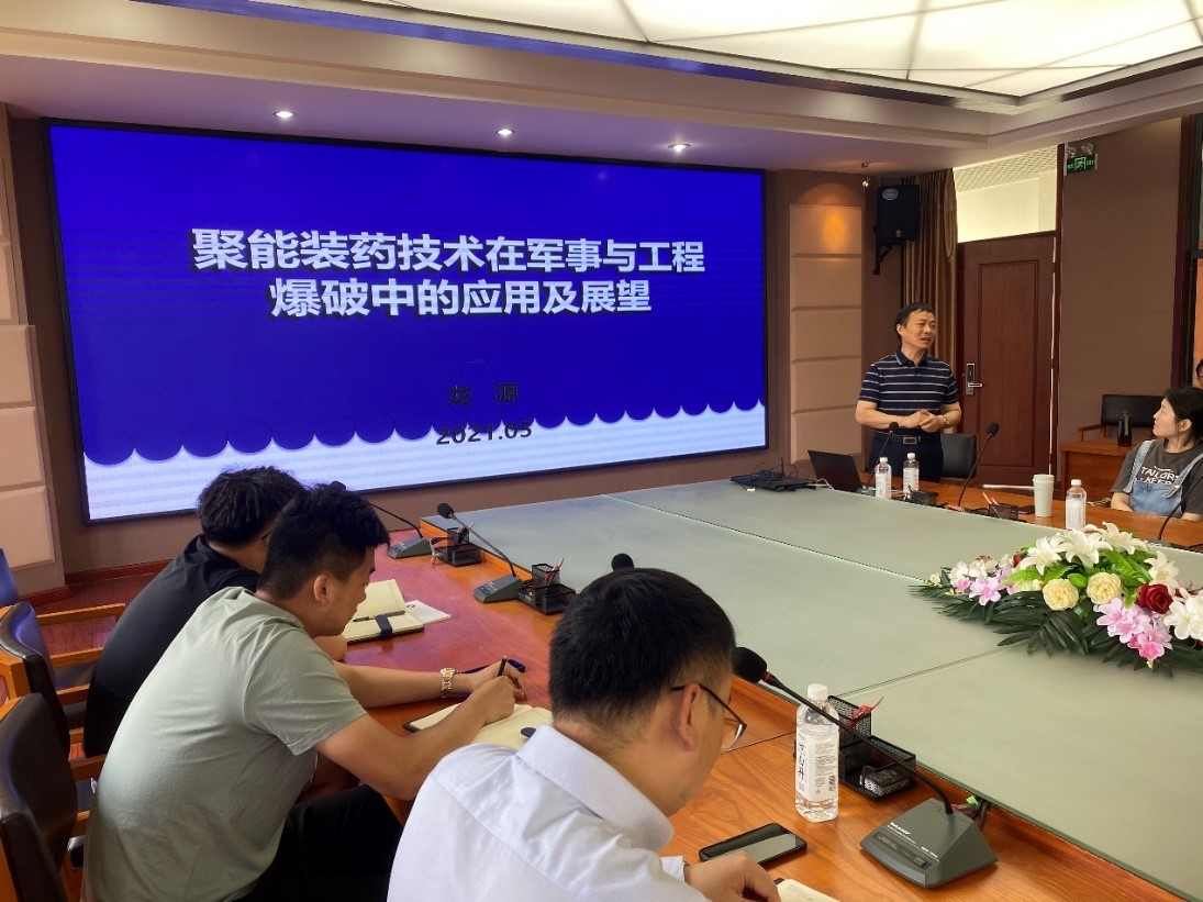 报告会上,龙源教授首先从聚能装药原理介绍了的聚能效应和金属聚能射流形成过程,结合原理详细叙述了聚能装药技术在在军事上、工程爆破中的广泛应用,最后龙源教授结合最新的研究介绍了聚能装药技术的发展方向。报告会后,龙源教授与师生展开了热烈的讨论,对同学们提出的问题进行了一一解答。报告会内容详实,运用了大量图像资料和数据,引领公司师生充分了解了聚能装药技术的研究前沿,激发了同学们的研究兴趣。