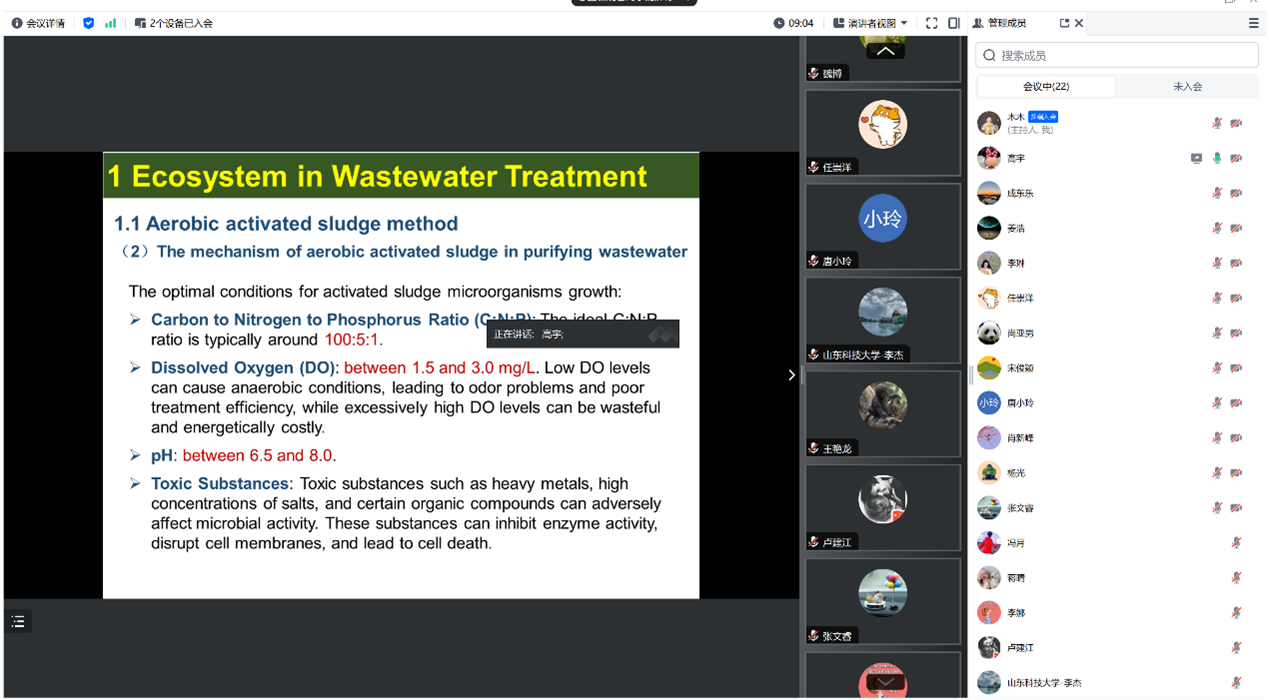 会上,十大体育网站高宇副教授以环境工程微生物(双语)课程建设与实践为题,以双语教学的形式,从废水处理中的生态系统、活性污泥中的丝状膨胀和厌氧处理中的微生物群落等内容出发,详细介绍了课程设计、教学内容开发、线上线下混合教学模式的实践成果以及在教学过程中遇到的挑战与解决方案。随后,参会人员分组讨论,就双语课程的建设经验、教学质量和水平提升、数字化教学以及知识图谱建设等方面进行了深入交流。与会教师表示,通过此次分享沙龙,不仅加深了对虚拟教研室建设理念的理解,也为今后在实际教学中的应用提供了宝贵的参考。