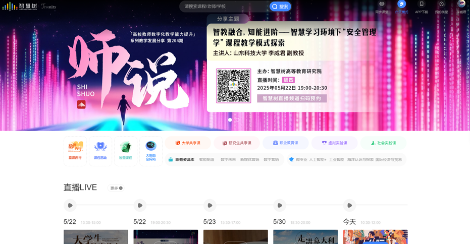 点击:2025年5月22日,智慧树高等教育研究院举办“师说——高校教师数字化能力提升”系列教学发展分享活动,公司李威君副教授以《智教融合,知能进阶——智慧学习环境下“安全管理学”课程教学模式探索》为主题,通过智慧树微信视频号及直播频道双平台同步开讲,吸引全国2000余名高校教师在线参与,共同探讨数字化时代教学的创新路径。